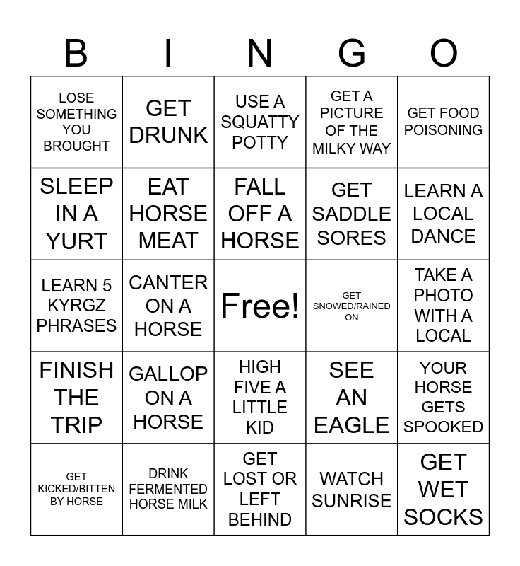 This bingo card has a free space and 24 words: GALLOP ON A HORSE, DRINK FERMENTED HORSE MILK, FALL OFF A HORSE, GET KICKED/BITTEN BY HORSE, GET FOOD POISONING, LOSE SOMETHING YOU BROUGHT, SLEEP IN A YURT, GET DRUNK, GET SNOWED/RAINED ON, HIGH FIVE A LITTLE KID, GET SADDLE SORES, LEARN 5 KYRGZ PHRASES, SEE AN EAGLE, YOUR HORSE GETS SPOOKED, EAT HORSE MEAT, WATCH SUNRISE, TAKE A PHOTO WITH A LOCAL, USE A SQUATTY POTTY, LEARN A LOCAL DANCE, CANTER ON A HORSE, GET WET SOCKS, FINISH THE TRIP, GET A PICTURE OF THE MILKY WAY and GET LOST OR LEFT BEHIND.