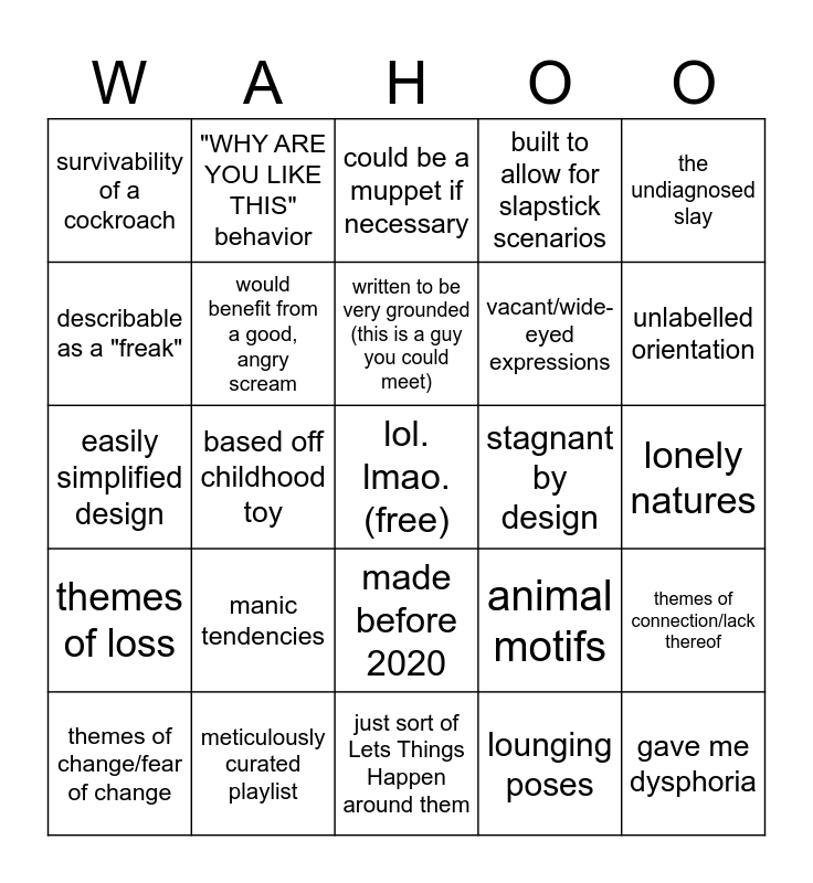 This bingo card has a free space and 24 words: manic tendencies, meticulously curated playlist, written to be very grounded (this is a guy you could meet), themes of change/fear of change, the undiagnosed slay, survivability of a cockroach, describable as a "freak", "WHY ARE YOU LIKE THIS" behavior, stagnant by design, made before 2020, vacant/wide-eyed expressions, easily simplified design, animal motifs, themes of connection/lack thereof, would benefit from a good, angry scream, lounging poses, lonely natures, could be a muppet if necessary, unlabelled orientation, based off childhood toy, gave me dysphoria, themes of loss, built to allow for slapstick scenarios and just sort of Lets Things Happen around them.