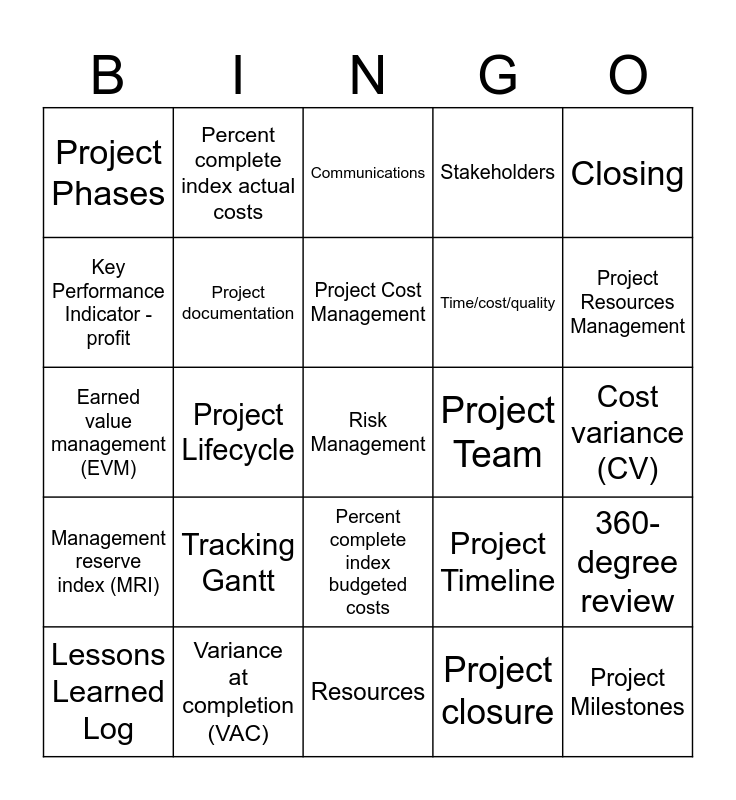 This bingo card has a free space and 57 words: Project Sponsor, Lessons Learned Log, Project Manager, Project Phases, Resources, Scope, Project documentation, Risk, Time/cost/quality, Project Schedule, Stakeholders, Project Control, Project Initiation, Planning, Project Delivery, Project Monitoring and Control, Closing, Project Lifecycle, Budget and costs, Project Milestones, Project Team, Project Board, Project Timeline, Communications, Project Schedule Management, Project Cost Management, Project Communications Management, Project Risk Management, Project Resources Management, Project Stakeholder Management, Potential Problem Identification, Traffic lights, Control chart, Cost performance index (CPI), Cost variance (CV), Key Performance Indicator - profit, Key Performance Indicator - non-profit, Earned value management (EVM), Forecasted total cost at completion (EACf), Management reserve index (MRI), Percent complete index actual costs, Percent complete index budgeted costs, Revised estimated cost at completion (EACre), Schedule variance (SV), Scheduling performance index (SPI), Scope creep, Tracking Gantt, Variance at completion (VAC), Lessons learned, Lessons learned repository, Performance review, Project closure, Project evaluation, Project maturity model, Retrospective, 360-degree review and Status report.
