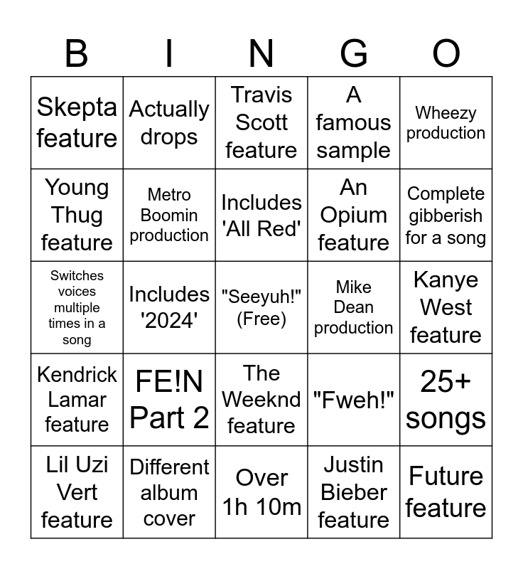 This bingo card has a free space and 24 words: FE!N Part 2, Different album cover, Includes 'All Red', Lil Uzi Vert feature, Wheezy production, Skepta feature, Young Thug feature, Actually drops, Mike Dean production, The Weeknd feature, An Opium feature, Switches voices multiple times in a song, "Fweh!", 25+ songs, Metro Boomin production, Justin Bieber feature, Kanye West feature, Travis Scott feature, Complete gibberish for a song, Includes '2024', Future feature, Kendrick Lamar feature, A famous sample and Over 1h 10m.