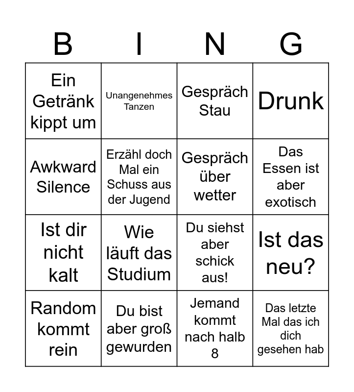 This bingo card has 16 words: Du bist aber groß gewurden, Ist das neu?, Gespräch Stau, Ein Getränk kippt um, Ist dir nicht kalt, Unangenehmes Tanzen, Du siehst aber schick aus!, Jemand kommt nach halb 8, Awkward Silence, Erzähl doch Mal ein Schuss aus der Jugend, Random kommt rein, Drunk, Wie läuft das Studium, Das Essen ist aber exotisch, Gespräch über wetter and Das letzte Mal das ich dich gesehen hab.
