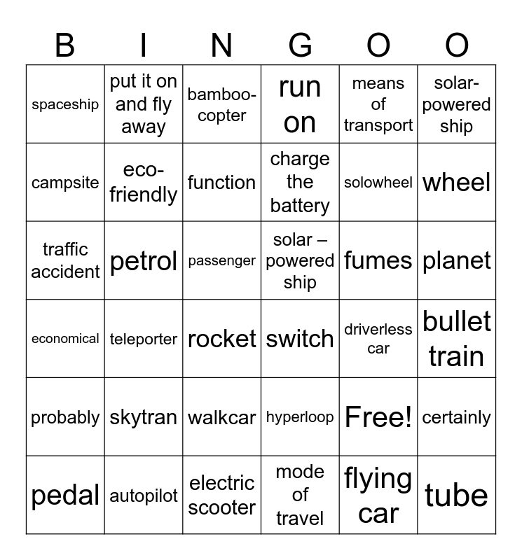 This bingo card has 37 words: Free!, hyperloop, flying car, campsite, teleporter, fumes, eco-friendly, mode of travel, means of transport, pedal, wheel, run on, traffic accident, passenger, solar-powered ship, solar –powered ship, skytran, bamboo-copter, planet, petrol, spaceship, charge the battery, rocket, driverless car, autopilot, bullet train, put it on and fly away, electric scooter, certainly, walkcar, selfbalancing, switch, solowheel, probably, economical, function and tube.