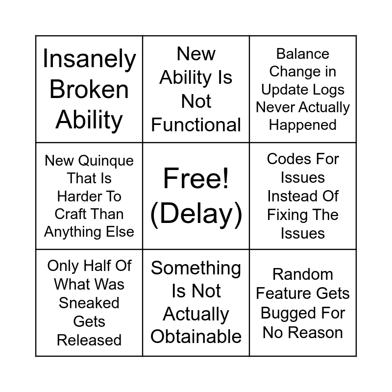 This bingo card has a free space and 8 words: Codes For Issues Instead Of Fixing The Issues, Balance Change in Update Logs Never Actually Happened, New Ability Is Not Functional, Only Half Of What Was Sneaked Gets Released, Insanely Broken Ability, Random Feature Gets Bugged For No Reason, New Quinque That Is Harder To Craft Than Anything Else and Something Is Not Actually Obtainable.