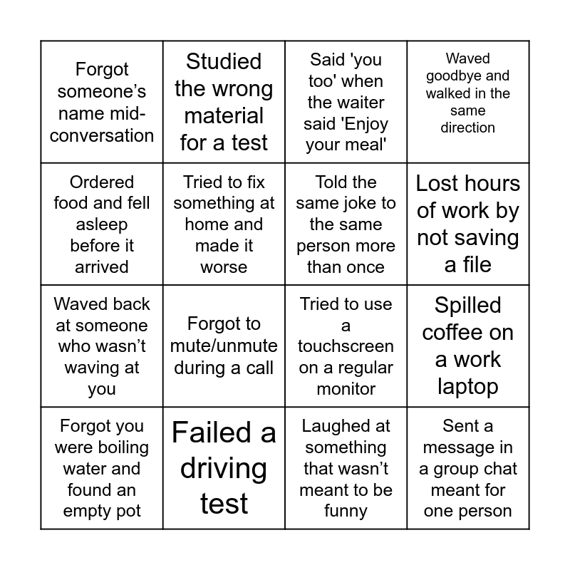 This bingo card has 16 words: Failed a driving test, Spilled coffee on a work laptop, Said 'you too' when the waiter said 'Enjoy your meal', Forgot someone’s name mid-conversation, Waved back at someone who wasn’t waving at you, Studied the wrong material for a test, Tried to use a touchscreen on a regular monitor, Laughed at something that wasn’t meant to be funny, Ordered food and fell asleep before it arrived, Tried to fix something at home and made it worse, Forgot you were boiling water and found an empty pot, Waved goodbye and walked in the same direction, Forgot to mute/unmute during a call, Lost hours of work by not saving a file, Told the same joke to the same person more than once and Sent a message in a group chat meant for one person.