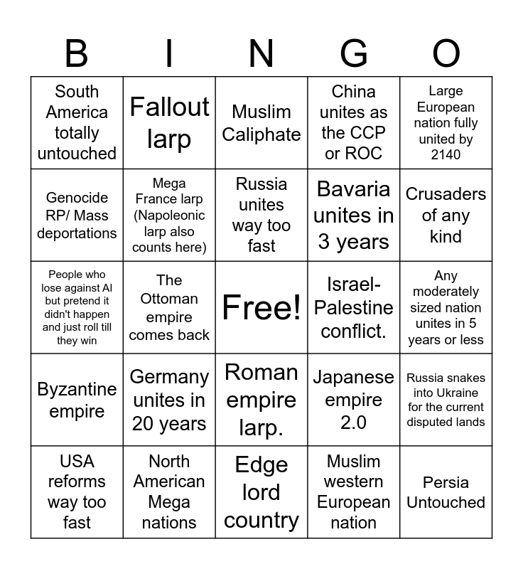 This bingo card has a free space and 24 words: Germany unites in 20 years, North American Mega nations, Russia unites way too fast, USA reforms way too fast, Large European nation fully united by 2140, South America totally untouched, Genocide RP/ Mass deportations, Fallout larp, Israel-Palestine conflict., Roman empire larp., Bavaria unites in 3 years, People who lose against AI but pretend it didn't happen and just roll till they win, Japanese empire 2.0, Russia snakes into Ukraine for the current disputed lands, Mega France larp (Napoleonic larp also counts here), Muslim western European nation, Any moderately sized nation unites in 5 years or less, Muslim Caliphate, Crusaders of any kind, The Ottoman empire comes back, Persia Untouched, Byzantine empire, China unites as the CCP or ROC and Edge lord country.