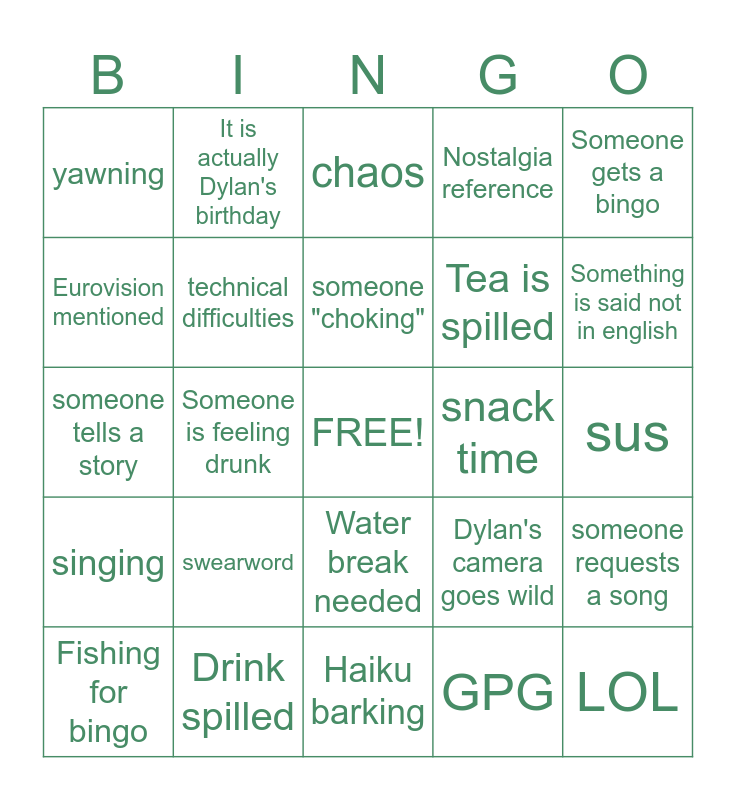 This bingo card has a free space and 31 words: Haiku barking, Someone takes a shot, Someone is feeling drunk, Someone is tired, yawning, chaos, technical difficulties, Dylan's camera goes wild, snack time, GPG, sus, LOL, forgot to unmute, "chair stream", Something is said not in english, sneezing, someone requests a song, swearword, singing, Water break needed, Someone gets a bingo, WTF, Fishing for bingo, It is actually Dylan's birthday, Tea is spilled, Eurovision mentioned, Nostalgia reference, someone tells a story, Drink spilled, someone "choking" and Silence.