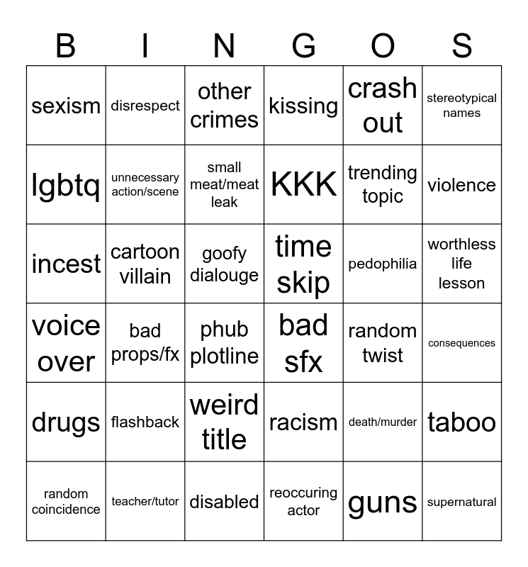 This bingo card has 36 words: racism, weird title, reoccuring actor, lgbtq, voice over, time skip, unnecessary action/scene, disabled, crash out, death/murder, violence, kissing, taboo, cartoon villain, KKK, sexism, drugs, pedophilia, incest, other crimes, goofy dialouge, bad props/fx, bad sfx, phub plotline, random twist, disrespect, trending topic, teacher/tutor, small meat/meat leak, stereotypical names, supernatural, random coincidence, consequences, worthless life lesson, flashback and guns.