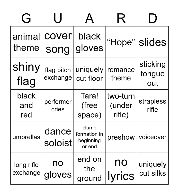 This bingo card has a free space and 39 words: blue, big sheet, ribbon sheet, flag pitch exchange, long rifle exchange, clump formation in beginning or end, uniquely cut floor, orange, slides, umbrellas, performer cries, “Hope”, uniquely cut silks, strapless rifle, two-turn (under rifle), dance soloist, airflag/air rifle, animal theme, dyed colored hair, preshow, shiny flag, end on the ground, romance theme, sticking tongue out, ensemble rifle toss, costume change, show starts with big toss, from texas, from california, cover song, arch prop, tan gloves, black gloves, no gloves, no lyrics, multiple intro claps, voiceover, black and red and from indiana.