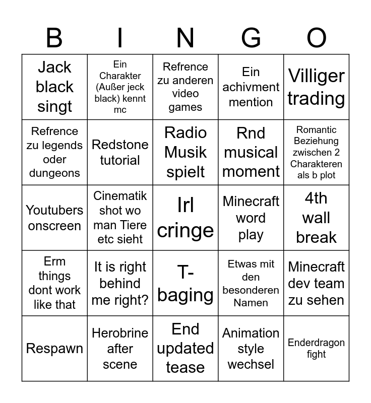 This bingo card has a free space and 24 words: It is right behind me right?, Herobrine after scene, Radio Musik spielt, Respawn, Villiger trading, Jack black singt, Refrence zu legends oder dungeons, Ein Charakter (Außer jeck black) kennt mc, Minecraft word play, T-baging, Rnd musical moment, Youtubers onscreen, Etwas mit den besonderen Namen, Minecraft dev team zu sehen, Redstone tutorial, Animation style wechsel, 4th wall break, Refrence zu anderen video games, Romantic Beziehung zwischen 2 Charakteren als b plot, Cinematik shot wo man Tiere etc sieht, Enderdragon fight, Erm things dont work like that, Ein achivment mention and End updated tease.