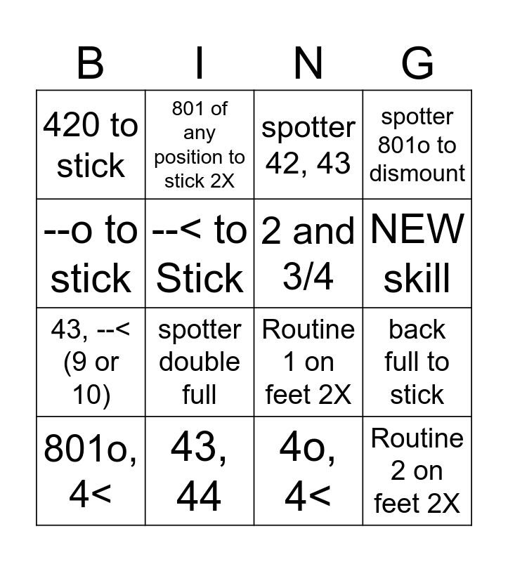 This bingo card has 16 words: 801o, 4<, 43, 44, spotter 42, 43, spotter 801o to dismount, --o to stick, 801 of any position to stick 2X, Routine 1 on feet 2X, back full to stick, 420 to stick, --< to Stick, 4o, 4<, NEW skill, 43, --< (9 or 10), spotter double full, 2 and 3/4 and Routine 2 on feet 2X.