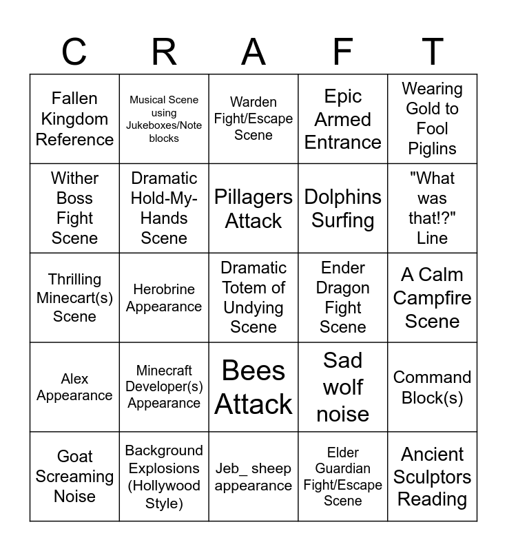 This bingo card has a free space and 24 words: Minecraft Developer(s) Appearance, Background Explosions (Hollywood Style), Pillagers Attack, Goat Screaming Noise, Wearing Gold to Fool Piglins, Fallen Kingdom Reference, Wither Boss Fight Scene, Musical Scene using Jukeboxes/Note blocks, Ender Dragon Fight Scene, Bees Attack, Dolphins Surfing, Thrilling Minecart(s) Scene, Sad wolf noise, Command Block(s), Dramatic Hold-My-Hands Scene, Elder Guardian Fight/Escape Scene, A Calm Campfire Scene, Warden Fight/Escape Scene, "What was that!?" Line, Herobrine Appearance, Ancient Sculptors Reading, Alex Appearance, Epic Armed Entrance and Jeb_ sheep appearance.