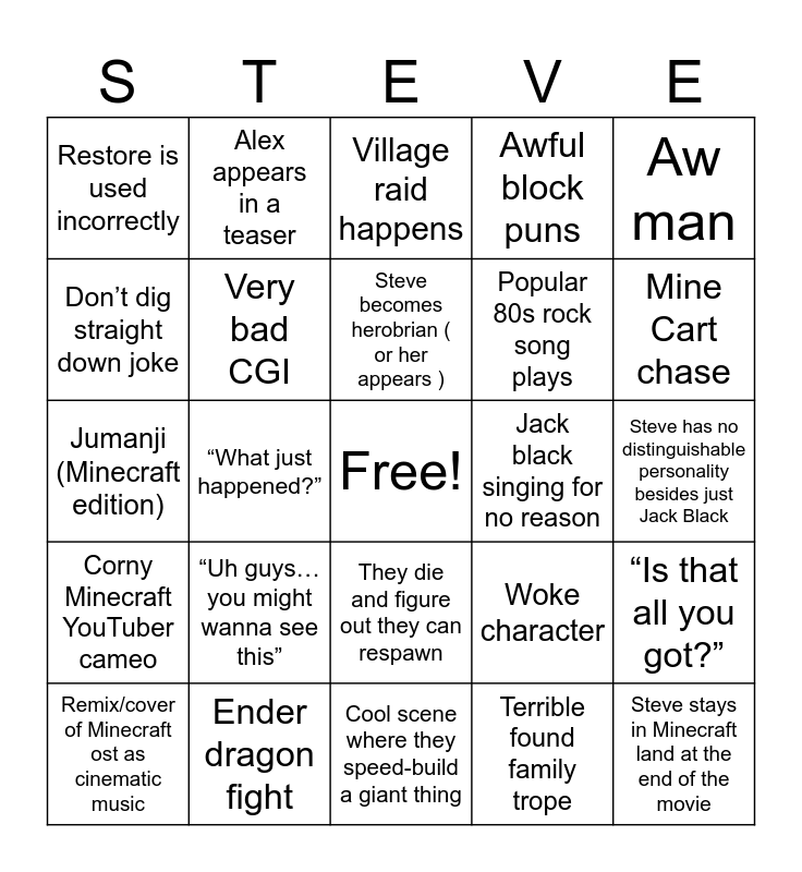 This bingo card has a free space and 24 words: Remix/cover of Minecraft ost as cinematic music, “Uh guys… you might wanna see this”, Steve becomes herobrian ( or her appears ), Terrible found family trope, Aw man, Restore is used incorrectly, Alex appears in a teaser, Village raid happens, Jack black singing for no reason, Steve has no distinguishable personality besides just Jack Black, Jumanji (Minecraft edition), Very bad CGI, Woke character, “Is that all you got?”, Don’t dig straight down joke, Ender dragon fight, Cool scene where they speed-build a giant thing, Awful block puns, Mine Cart chase, Corny Minecraft YouTuber cameo, “What just happened?”, They die and figure out they can respawn, Popular 80s rock song plays and Steve stays in Minecraft land at the end of the movie.