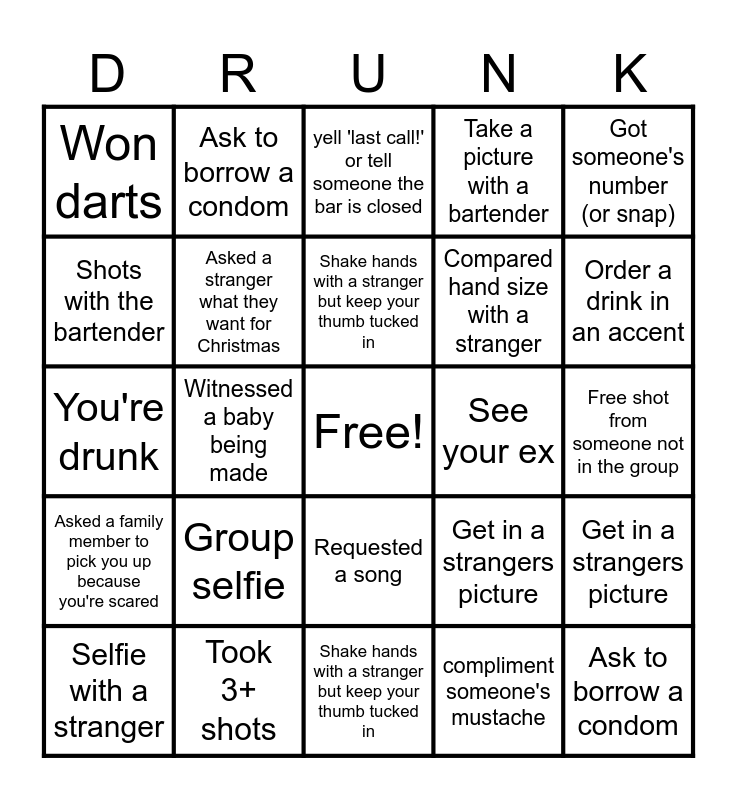This bingo card has a free space and 29 words: Selfie with a stranger, Drank a full drink while holding hands with someone, Witnessed a baby being made, witnessed a party foul (drink spill or fight), Won darts, yell 'last call!' or tell someone the bar is closed, Asked a stranger what they want for Christmas, Group selfie, See your ex, Took 3+ shots, Free shot from someone not in the group, Ask to borrow a condom, Shake hands with a stranger but keep your thumb tucked in, compliment someone's mustache, Order a drink in an accent, See someone in lingerie, Requested a song, Asked a family member to pick you up because you're scared, Got someone's number (or snap), You're drunk, Get in a strangers picture, talked to someone on someone else's phone, Compared hand size with a stranger, Shots with the bartender, Take a picture with a bartender, Ask to borrow a condom, Get in a strangers picture, Shake hands with a stranger but keep your thumb tucked in and Make it to the blind pig.