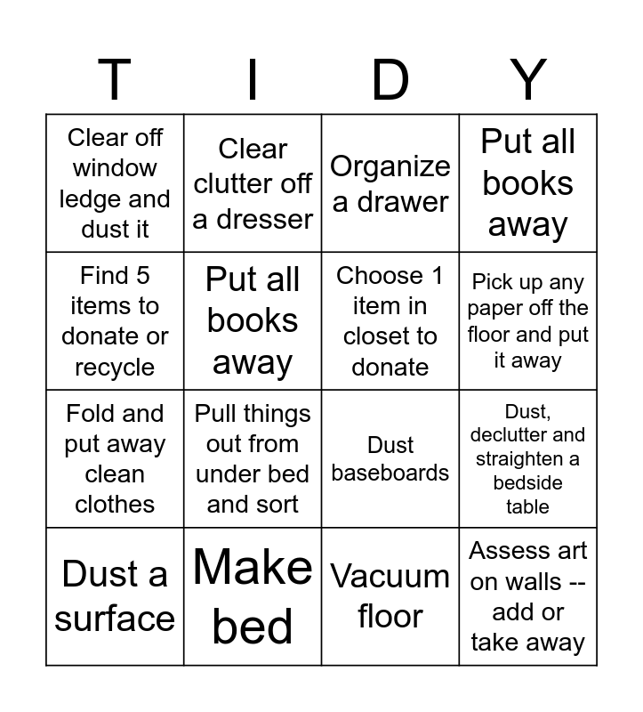 This bingo card has 16 words: Make bed, Dust, declutter and straighten a bedside table, Organize a drawer, Clear off window ledge and dust it, Fold and put away clean clothes, Clear clutter off a dresser, Dust baseboards, Vacuum floor, Find 5 items to donate or recycle, Put all books away, Dust a surface, Put all books away, Pull things out from under bed and sort, Pick up any paper off the floor and put it away, Choose 1 item in closet to donate and Assess art on walls -- add or take away.