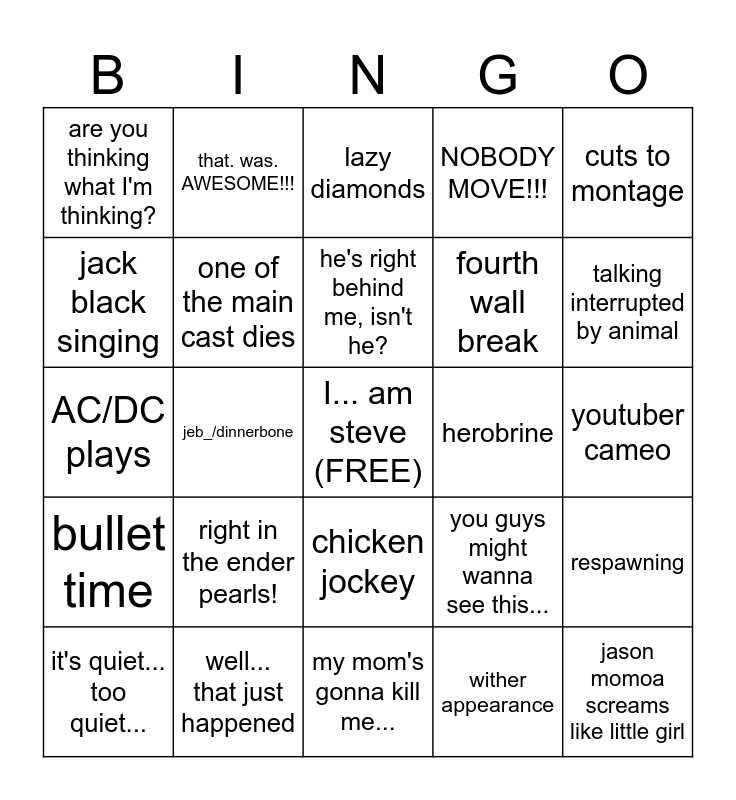 This bingo card has a free space and 24 words: right in the ender pearls!, well... that just happened, he's right behind me, isn't he?, it's quiet... too quiet..., cuts to montage, are you thinking what I'm thinking?, jack black singing, that. was. AWESOME!!!, herobrine, chicken jockey, fourth wall break, AC/DC plays, you guys might wanna see this..., respawning, one of the main cast dies, wither appearance, youtuber cameo, lazy diamonds, talking interrupted by animal, jeb_/dinnerbone, jason momoa screams like little girl, bullet time, NOBODY MOVE!!! and my mom's gonna kill me....