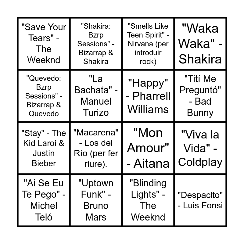 This bingo card has 26 words: Free!, "As It Was" - Harry Styles, "Tití Me Preguntó" - Bad Bunny, "Flowers" - Miley Cyrus, "Quevedo: Bzrp Sessions" - Bizarrap & Quevedo, "Save Your Tears" - The Weeknd, "La Bachata" - Manuel Turizo, "Shakira: Bzrp Sessions" - Bizarrap & Shakira, "Blinding Lights" - The Weeknd, "Dákiti" - Bad Bunny, "Stay" - The Kid Laroi & Justin Bieber, "Mon Amour" - Aitana, "Don’t Start Now" - Dua Lipa, "Watermelon Sugar" - Harry Styles, "Viva la Vida" - Coldplay, "Gasolina" - Daddy Yankee, "Waka Waka" - Shakira, "Despacito" - Luis Fonsi, "Smells Like Teen Spirit" - Nirvana (per introduir rock), "Ai Se Eu Te Pego" - Michel Teló, "Macarena" - Los del Río (per fer riure)., "Shape of You" - Ed Sheeran, "Uptown Funk" - Bruno Mars, "Mi Gente" - J Balvin, "Happy" - Pharrell Williams and "Billie Jean" - Michael Jackson..
