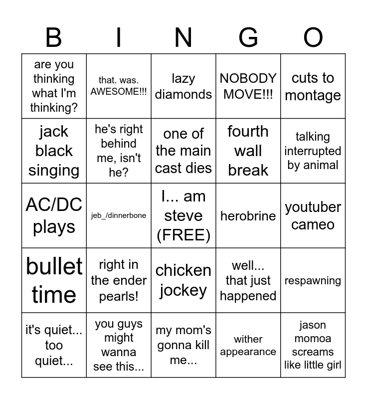 This bingo card has a free space and 24 words: right in the ender pearls!, you guys might wanna see this..., one of the main cast dies, it's quiet... too quiet..., cuts to montage, are you thinking what I'm thinking?, jack black singing, that. was. AWESOME!!!, herobrine, chicken jockey, fourth wall break, AC/DC plays, well... that just happened, respawning, he's right behind me, isn't he?, wither appearance, youtuber cameo, lazy diamonds, talking interrupted by animal, jeb_/dinnerbone, jason momoa screams like little girl, bullet time, NOBODY MOVE!!! and my mom's gonna kill me....