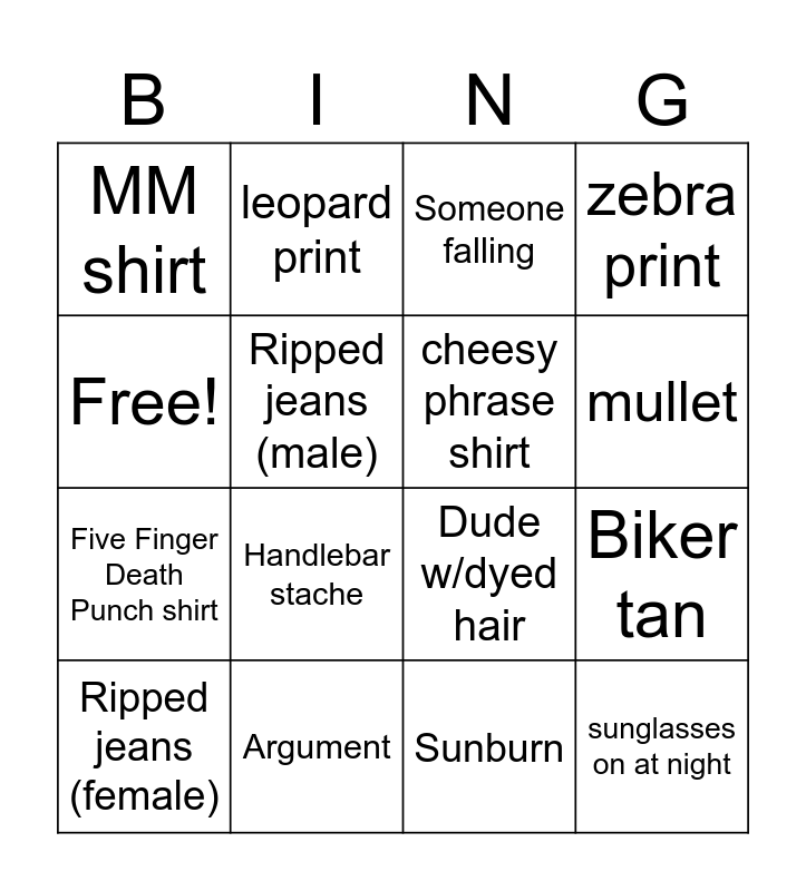 This bingo card has 16 words: Argument, Biker tan, Someone falling, MM shirt, Five Finger Death Punch shirt, leopard print, Dude w/dyed hair, Sunburn, Free!, Ripped jeans (male), Ripped jeans (female), zebra print, Handlebar stache, mullet, cheesy phrase shirt and sunglasses on at night.