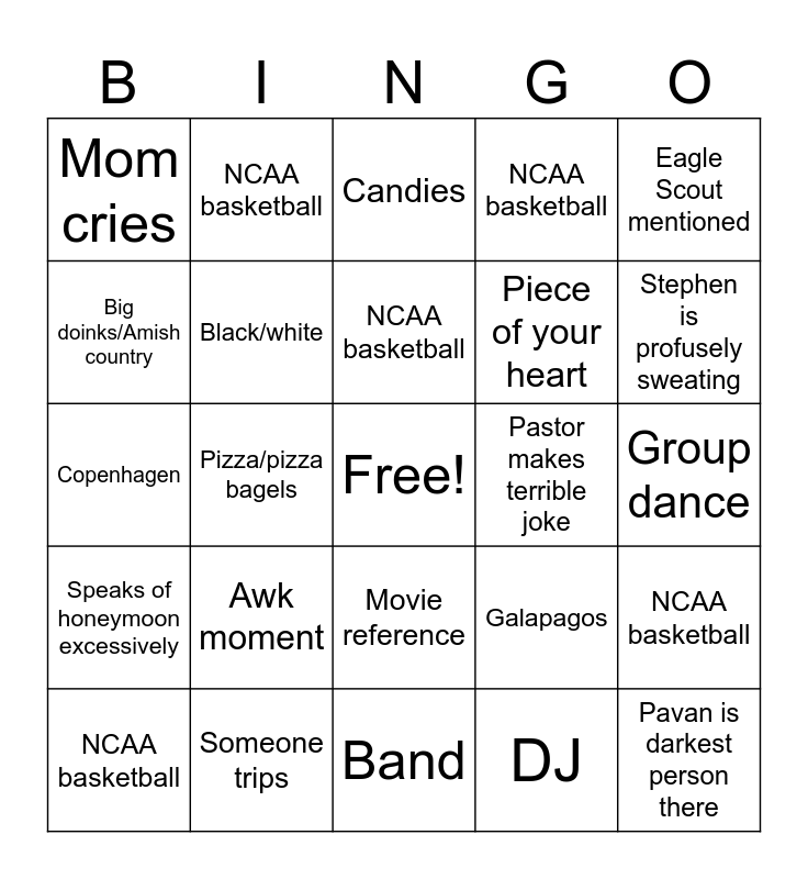 This bingo card has a free space and 29 words: NCAA basketball, UT stuff, Pizza/pizza bagels, Light beer, Mom cries, Candies, Black/white, Awk moment, Pastor makes terrible joke, Someone trips, Group dance, Pavan is darkest person there, Band, DJ, Stephen is profusely sweating, Shirt off, Movie reference, Speaks of honeymoon excessively, Eagle Scout mentioned, Copenhagen, Galapagos, Sorority yell, Piece of your heart, Big doinks/Amish country, NCAA basketball, NCAA basketball, NCAA basketball, NCAA basketball and NCAA basketball.