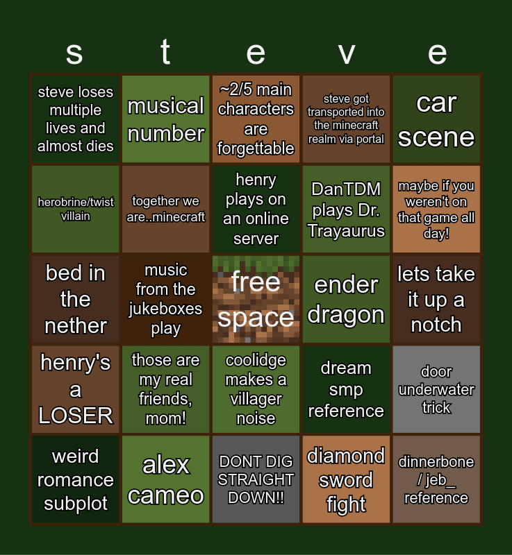 This bingo card has a free space and 24 words: those are my real friends, mom!, alex cameo, henry plays on an online server, weird romance subplot, car scene, steve loses multiple lives and almost dies, herobrine/twist villain, musical number, ender dragon, coolidge makes a villager noise, DanTDM plays Dr. Trayaurus, bed in the nether, dream smp reference, door underwater trick, together we are..minecraft, diamond sword fight, lets take it up a notch, ~2/5 main characters are forgettable, maybe if you weren't on that game all day!, music from the jukeboxes play, dinnerbone / jeb_ reference, henry's a LOSER, steve got transported into the minecraft realm via portal and DONT DIG STRAIGHT DOWN!!.