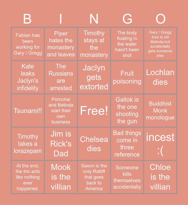 This bingo card has a free space and 24 words: Jim is Rick's Dad, Mook is the villian, Jaclyn gets extorted, At the end, the trio acts like nothing ever happened., Gary / Gregg tries to kill Belinda but accidentally gets someone else, Fabian has been working for Gary / Gregg, Kate leaks Jaclyn's infidelity, Piper hates the monastery and leaves, Gaitok is the one shooting the gun, Chelsea dies, Fruit poisoning, Tsunami!!, Bad things come in three reference, incest :(, The Russians are arrested, Someone kills themselves accidentally, Buddhist Monk monologue, Timothy stays at the monastery, Lochlan dies, Pornchai and Belinda start their own business, Chloe is the villian, Timothy takes a lorazepam, The body floating in the water hasn't been shot and Saxon is the only Ratliff that goes back to America.