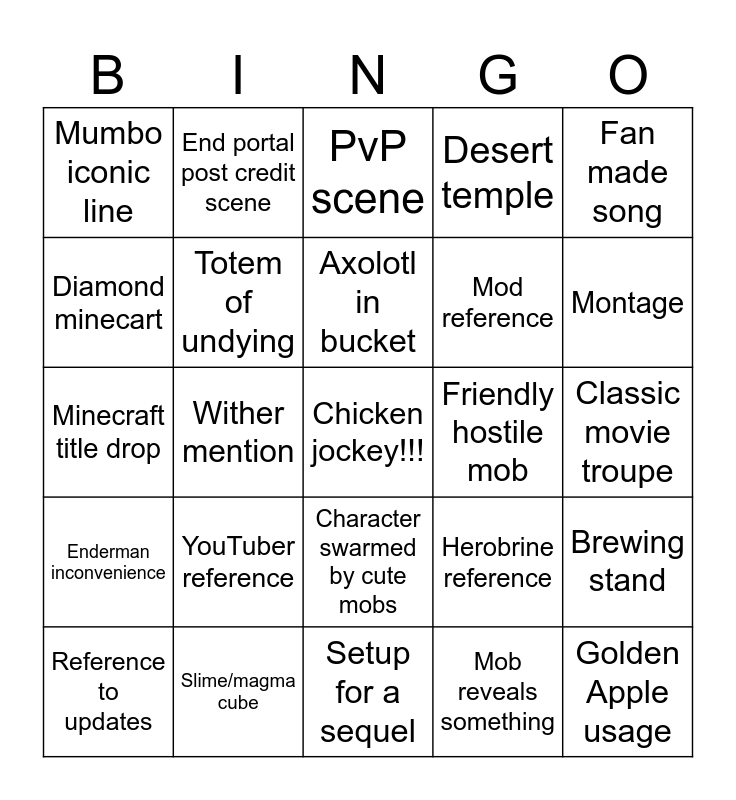 This bingo card has a free space and 24 words: YouTuber reference, Slime/magma cube, Axolotl in bucket, Reference to updates, Fan made song, Mumbo iconic line, Diamond minecart, End portal post credit scene, Friendly hostile mob, Character swarmed by cute mobs, Mod reference, Minecraft title drop, Herobrine reference, Brewing stand, Totem of undying, Mob reveals something, Classic movie troupe, PvP scene, Montage, Wither mention, Golden Apple usage, Enderman inconvenience, Desert temple and Setup for a sequel.
