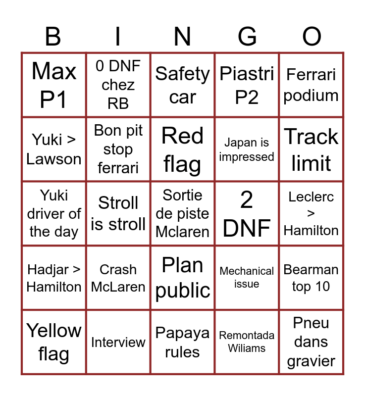 This bingo card has 25 words: Crash McLaren, Papaya rules, Red flag, Yellow flag, Ferrari podium, Max P1, Yuki > Lawson, 0 DNF chez RB, 2 DNF, Plan public, Japan is impressed, Yuki driver of the day, Mechanical issue, Bearman top 10, Bon pit stop ferrari, Pneu dans gravier, Leclerc > Hamilton, Safety car, Track limit, Stroll is stroll, Sortie de piste Mclaren, Interview, Hadjar > Hamilton, Piastri P2 and Remontada Wiliams.