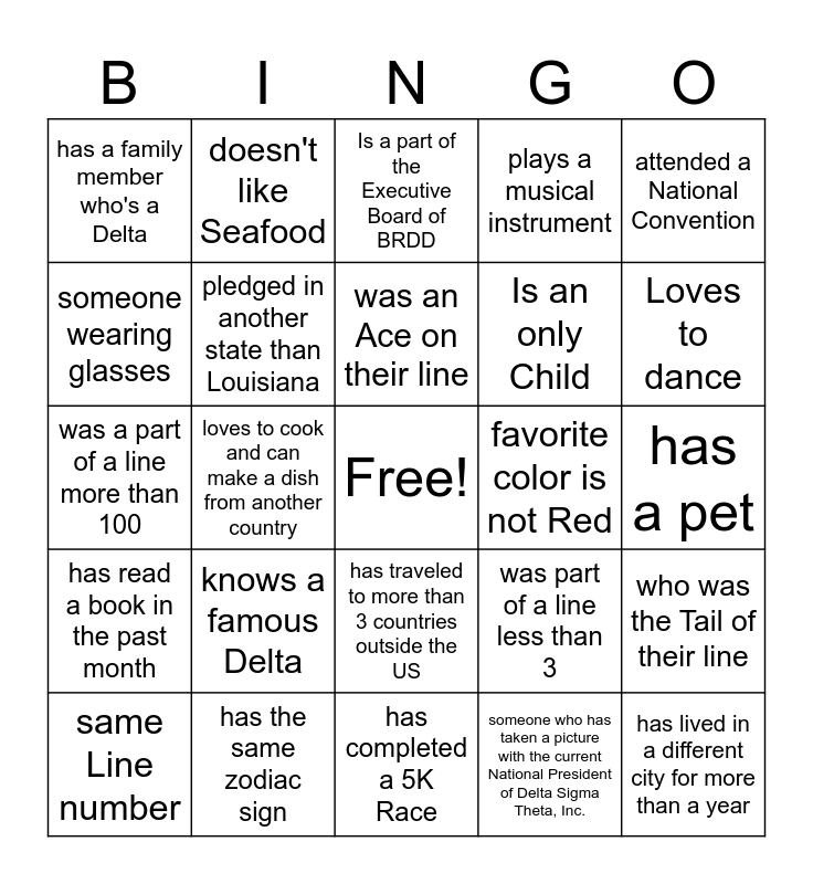 This bingo card has a free space and 24 words: knows a famous Delta, has the same zodiac sign, was an Ace on their line, same Line number, attended a National Convention, has a family member who's a Delta, someone wearing glasses, doesn't like Seafood, favorite color is not Red, has traveled to more than 3 countries outside the US, Is an only Child, was a part of a line more than 100, was part of a line less than 3, who was the Tail of their line, pledged in another state than Louisiana, someone who has taken a picture with the current National President of Delta Sigma Theta, Inc., has a pet, Is a part of the Executive Board of BRDD, Loves to dance, loves to cook and can make a dish from another country, has lived in a different city for more than a year, has read a book in the past month, plays a musical instrument and has completed a 5K Race.
