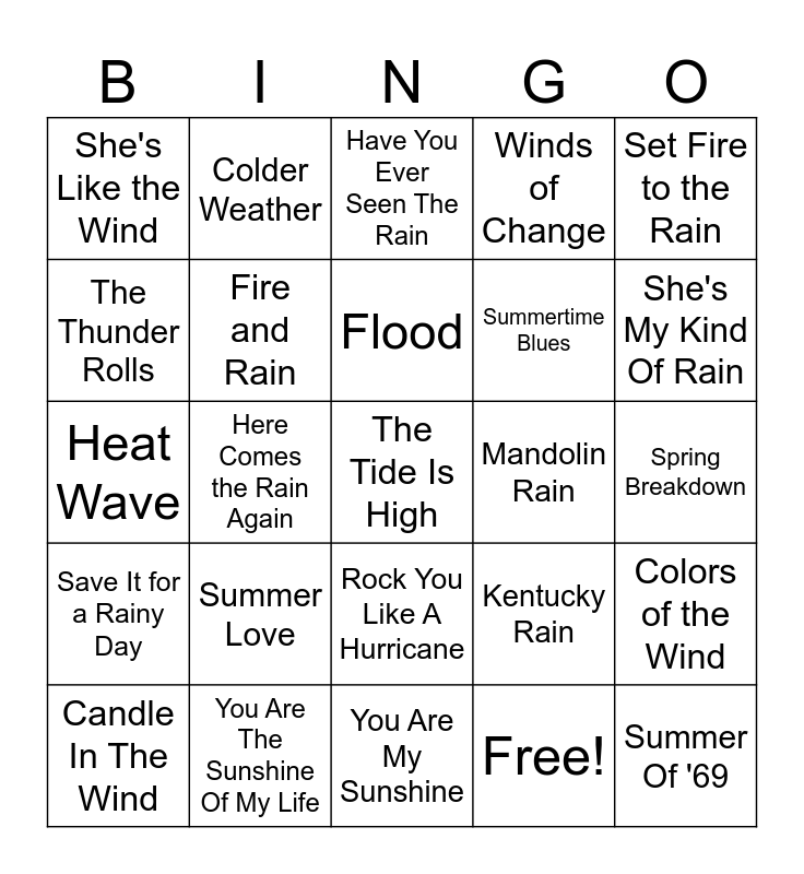 This bingo card has 32 words: Free!, Wind Beneath My Wings, Here Comes the Rain Again, I Love a Rainy Night, Save It for a Rainy Day, Fire and Rain, Set Fire to the Rain, Colors of the Wind, Colder Weather, Summer Of '69, Flood, Have You Ever Seen The Rain, Dust in the Wind, Thunder, Mandolin Rain, Sunshine On My Shoulders, Candle In The Wind, Heat Wave, Rock You Like A Hurricane, Summer Love, Kentucky Rain, Spring Vacation, Spring Breakdown, You Are The Sunshine Of My Life, The Tide Is High, Winds of Change, Summertime Blues, The Thunder Rolls, She's Like the Wind, You Are My Sunshine, Umbrella and She's My Kind Of Rain.
