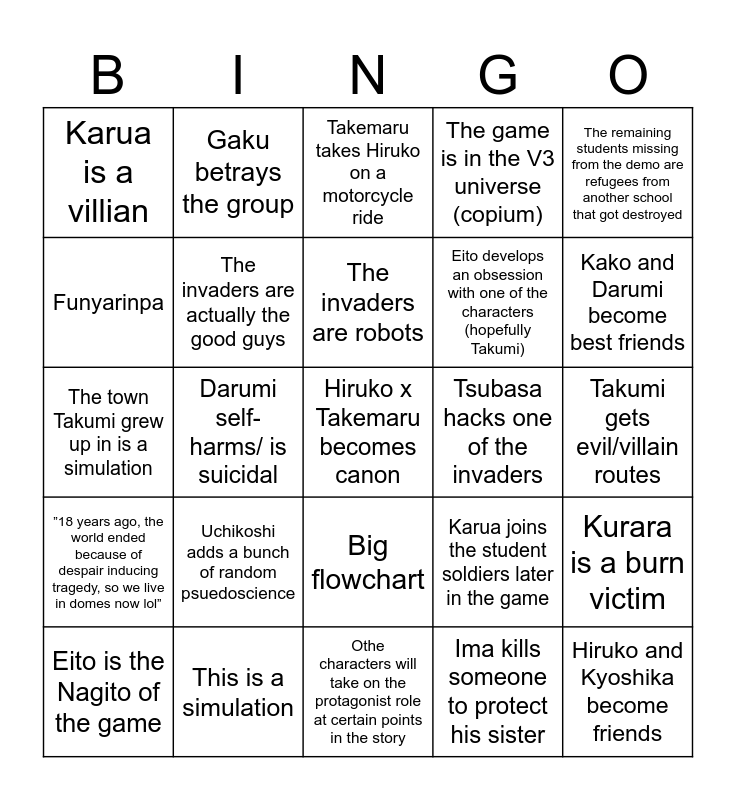 This bingo card has a free space and 24 words: Uchikoshi adds a bunch of random psuedoscience, This is a simulation, The invaders are robots, Eito is the Nagito of the game, The remaining students missing from the demo are refugees from another school that got destroyed, Karua is a villian, Funyarinpa, Gaku betrays the group, Tsubasa hacks one of the invaders, Big flowchart, Eito develops an obsession with one of the characters (hopefully Takumi), The town Takumi grew up in is a simulation, Karua joins the student soldiers later in the game, Kurara is a burn victim, The invaders are actually the good guys, Ima kills someone to protect his sister, Takumi gets evil/villain routes, Takemaru takes Hiruko on a motorcycle ride, Kako and Darumi become best friends, Darumi self-harms/ is suicidal, Hiruko and Kyoshika become friends, ”18 years ago, the world ended because of despair inducing tragedy, so we live in domes now lol”, The game is in the V3 universe (copium) and Othe characters will take on the protagonist role at certain points in the story.