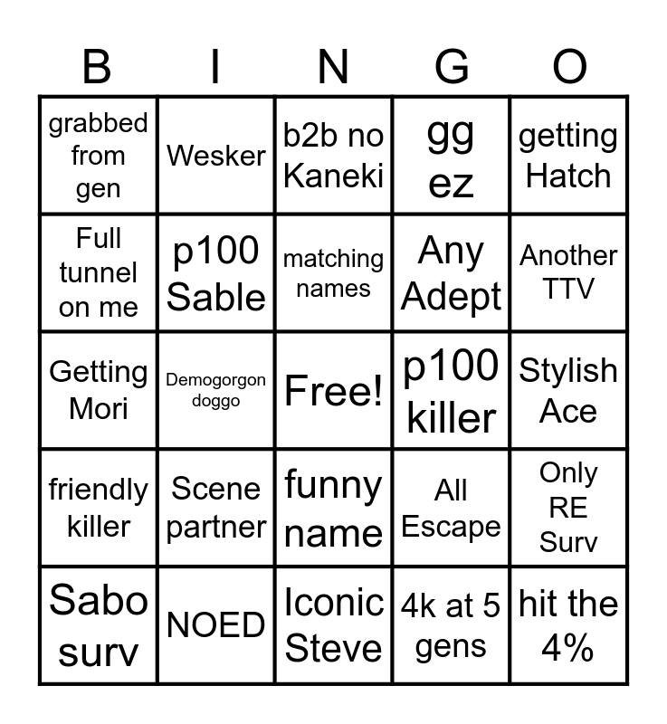 This bingo card has a free space and 24 words: Scene partner, NOED, matching names, Sabo surv, getting Hatch, grabbed from gen, Full tunnel on me, Wesker, p100 killer, funny name, Any Adept, Getting Mori, All Escape, Only RE Surv, p100 Sable, 4k at 5 gens, Stylish Ace, b2b no Kaneki, Another TTV, Demogorgon doggo, hit the 4%, friendly killer, gg ez and Iconic Steve.