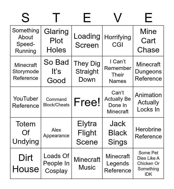 This bingo card has a free space and 24 words: Dirt House, Alex Appearance, They Dig Straight Down, Minecraft Legends Reference, Mine Cart Chase, Something About Speed-Running, Glaring Plot Holes, Loading Screen, Can’t Actually Be Done In Minecraft, Animation Actually Locks In, YouTuber Reference, So Bad It’s Good, Jack Black Sings, Herobrine Reference, Minecraft Storymode Reference, Loads Of People In Cosplay, Minecraft Music, Horrifying CGI, Minecraft Dungeons Reference, Totem Of Undying, Command Block/Cheats, Elytra Flight Scene, I Can’t Remember Their Names and Some Pet Dies Like A Chicken Or Something IDK.