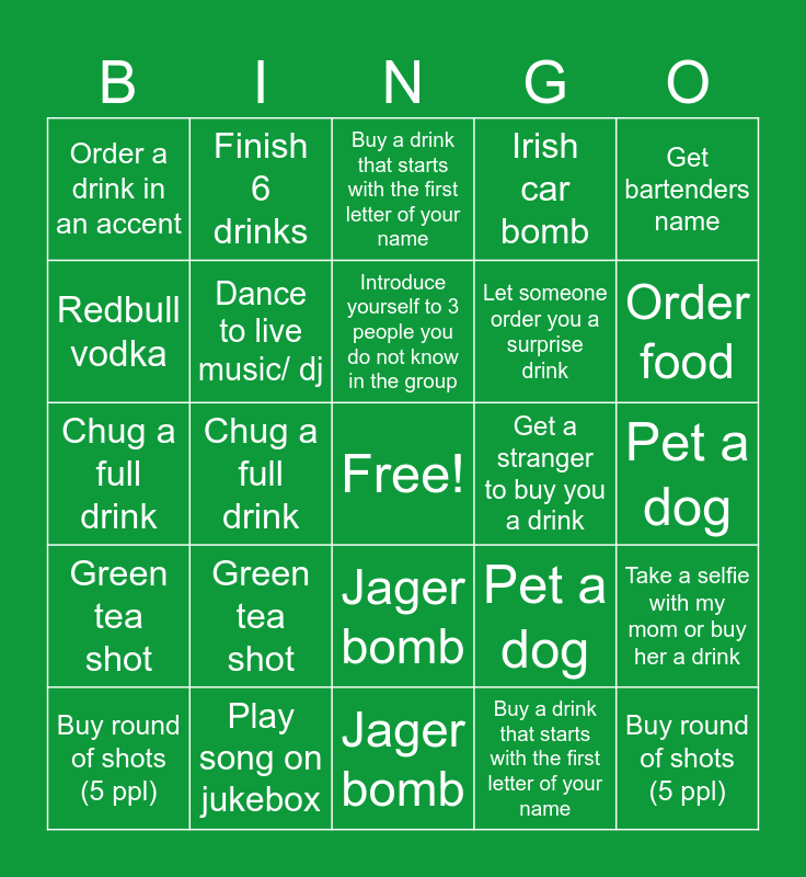 ⚠ This card has duplicate items: Order food (2), Buy round of shots (5 ppl) (2), Take a selfie with a stranger (3), Jager bomb (2), Green tea shot (2), Buy birthday boy a drink (2), Finish 6 drinks (2), Drink espresso martini (2), Redbull vodka (2), Play song on jukebox (2), Dance to live music/ dj (2), Irish car bomb (2), Take a selfie with my mom or buy her a drink (2), Pet a dog (2), Take an article of clothing from stranger (2), Introduce yourself to 3 people you do not know in the group (2), Get a stranger to buy you a drink (2), Do the cotton eye Joe (2), Get bartenders name (2), Chug a full drink (2), Buy a drink that starts with the first letter of your name (2), Order a drink in an accent (2), Let someone order you a surprise drink (2), Post a story on your insta from the bar crawl (2)