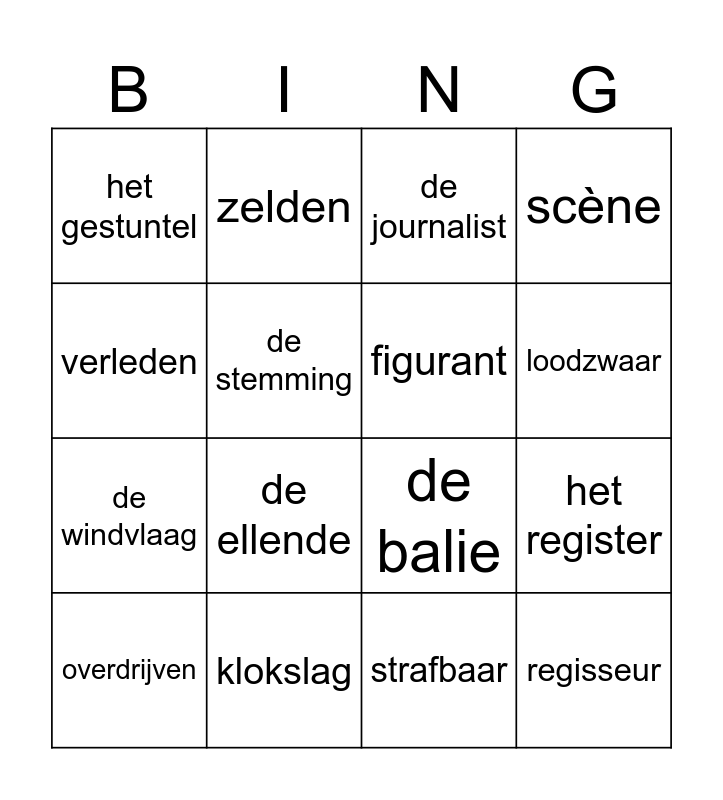 This bingo card has 16 words: klokslag, het register, de journalist, het gestuntel, de windvlaag, zelden, de balie, strafbaar, verleden, de stemming, overdrijven, scène, de ellende, loodzwaar, figurant and regisseur.