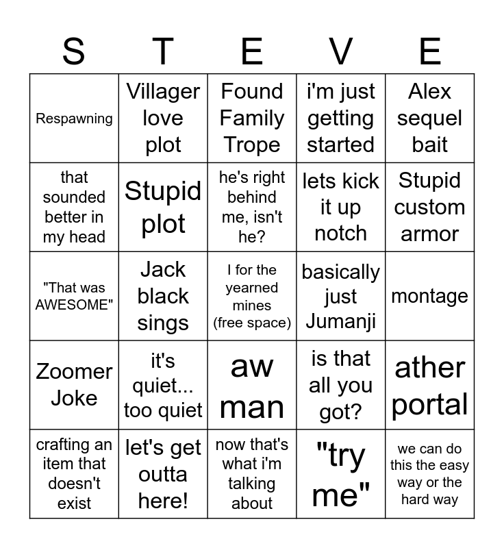 This bingo card has a free space and 24 words: it's quiet... too quiet, let's get outta here!, he's right behind me, isn't he?, crafting an item that doesn't exist, Alex sequel bait, Respawning, that sounded better in my head, Villager love plot, basically just Jumanji, aw man, lets kick it up notch, "That was AWESOME", is that all you got?, ather portal, Stupid plot, "try me", montage, Found Family Trope, Stupid custom armor, Jack black sings, we can do this the easy way or the hard way, Zoomer Joke, i'm just getting started and now that's what i'm talking about.