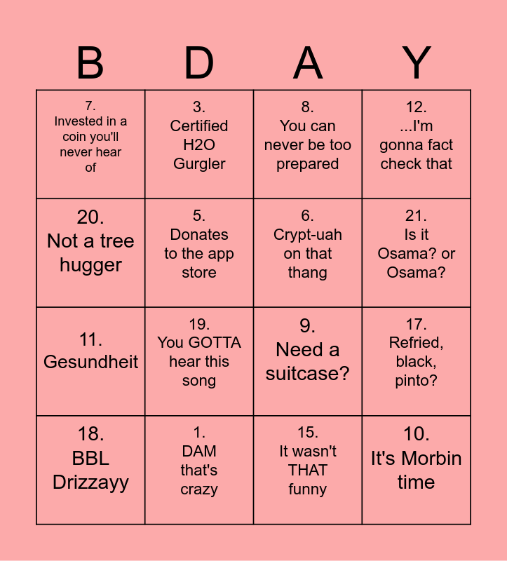 This bingo card has 22 words: 1. DAM that's crazy, 2. Birdgate, 3. Certified H2O Gurgler, 4. A real head scratcher, 5. Donates to the app store, 6. Crypt-uah on that thang, 7. Invested in a coin you'll never hear of, 8. You can never be too prepared, 9. Need a suitcase?, 10. It's Morbin time, 11. Gesundheit, 12. ...I'm gonna fact check that, 13. Simply refreshing, 14. Can't get a word in, 15. It wasn't THAT funny, 16. They've GOTTA ask for a raise, 17. Refried, black, pinto?, 18. BBL Drizzayy, 19. You GOTTA hear this song, 20. Not a tree hugger, 21. Is it Osama? or Osama? and 22. Does anyone know her?.