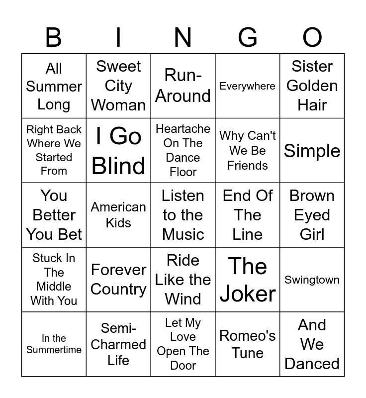 This bingo card has 54 words: Free!, Stuck In The Middle With You, Spirit in the Sky, Do You Believe in Magic?, Ride Like the Wind, For What It's Worth, Everywhere, Send Me on My Way, Right Back Where We Started From, One Way Or Another, All Summer Long, Tubthumping, Semi-Charmed Life, In the Summertime, What I Like About You, Let My Love Open The Door, Listen to the Music, Why Can't We Be Friends, Lido Shuffle, Brown Eyed Girl, The Joker, Give A Little Bit, End Of The Line, Sister Golden Hair, The Weight, Sweet City Woman, Do Wah Diddy Diddy, Dance the Night Away, Come Dancing, Romeo's Tune, Love the One You're With, Ride Captain Ride, Do Ya, Loves Me Like a Rock, Run-Around, Pink Houses, You Better You Bet, Swingtown, And We Danced, I Go Blind, You Might Think, Already Gone, Let's Go, Fast as You, Forever Country, Save a Horse (Ride a Cowboy), Would You Go With Me, I Love This Bar, Heartache On The Dance Floor, American Kids, Simple, Only the Good Die Young, My Best Friend's Girl and Sweet Caroline.