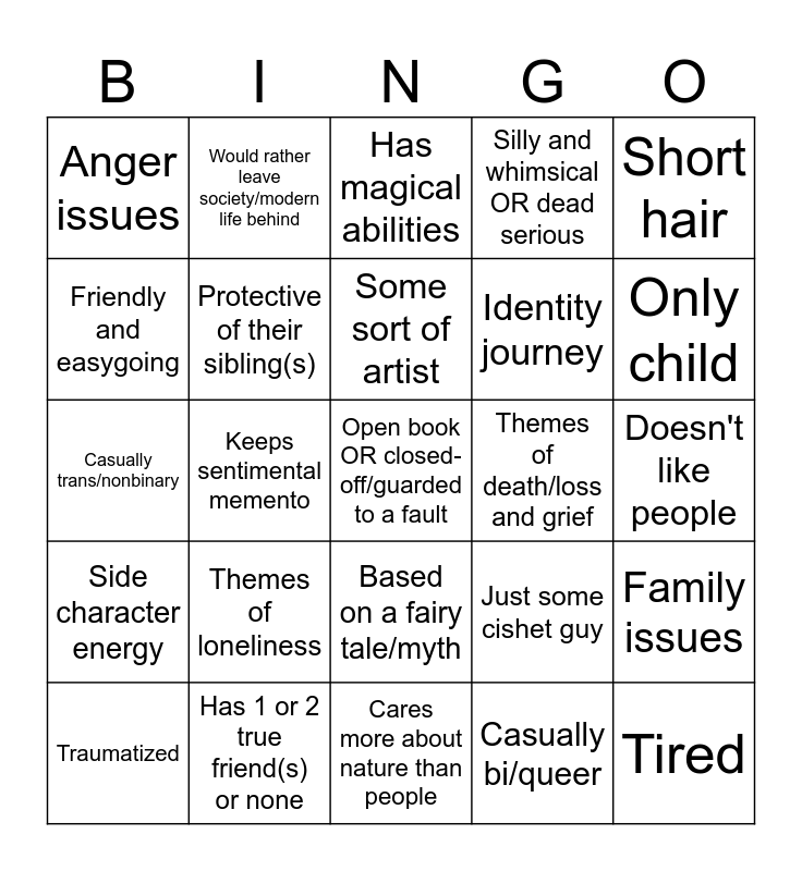 This bingo card has a free space and 24 words: Themes of loneliness, Has 1 or 2 true friend(s) or none, Some sort of artist, Traumatized, Short hair, Anger issues, Friendly and easygoing, Would rather leave society/modern life behind, Themes of death/loss and grief, Based on a fairy tale/myth, Identity journey, Casually trans/nonbinary, Just some cishet guy, Family issues, Protective of their sibling(s), Casually bi/queer, Doesn't like people, Has magical abilities, Only child, Keeps sentimental memento, Tired, Side character energy, Silly and whimsical OR dead serious and Cares more about nature than people.