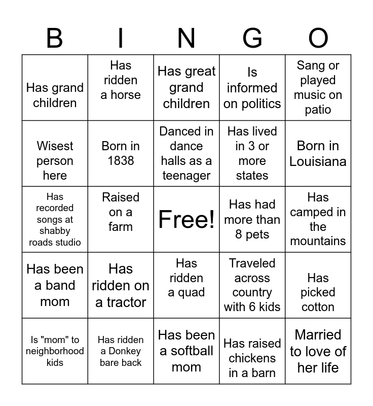This bingo card has a free space and 24 words: Has ridden on a tractor, Has ridden a Donkey bare back, Danced in dance halls as a teenager, Is "mom" to neighborhood kids, Sang or played music on patio, Has grand children, Wisest person here, Has ridden a horse, Has had more than 8 pets, Has ridden a quad, Has lived in 3 or more states, Has recorded songs at shabby roads studio, Traveled across country with 6 kids, Has picked cotton, Born in 1838, Has raised chickens in a barn, Has camped in the mountains, Has great grand children, Born in Louisiana, Raised on a farm, Married to love of her life, Has been a band mom, Is informed on politics and Has been a softball mom.