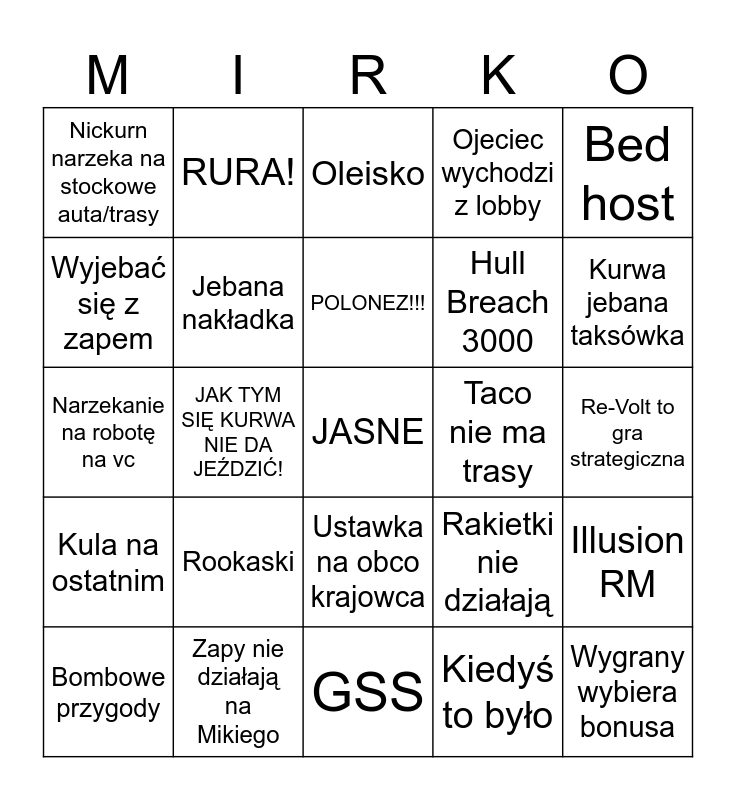 This bingo card has a free space and 24 words: Rookaski, Zapy nie działają na Mikiego, POLONEZ!!!, Bombowe przygody, Bed host, Nickurn narzeka na stockowe auta/trasy, Wyjebać się z zapem, RURA!, Taco nie ma trasy, Ustawka na obco krajowca, Hull Breach 3000, Narzekanie na robotę na vc, Rakietki nie działają, Illusion RM, Jebana nakładka, Kiedyś to było, Re-Volt to gra strategiczna, Oleisko, Kurwa jebana taksówka, JAK TYM SIĘ KURWA NIE DA JEŹDZIĆ!, Wygrany wybiera bonusa, Kula na ostatnim, Ojeciec wychodzi z lobby and GSS.