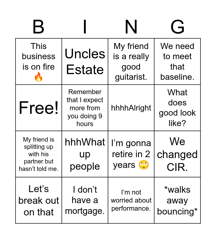 This bingo card has 16 words: I don’t have a mortgage., We changed CIR., My friend is a really good guitarist., This business is on fire 🔥, My friend is splitting up with his partner but hasn’t told me., Uncles Estate, I’m gonna retire in 2 years 🙄, I’m not worried about performance., Free!, Remember that I expect more from you doing 9 hours, Let’s break out on that, We need to meet that baseline., hhhWhat up people, What does good look like?, hhhhAlright and *walks away bouncing*.