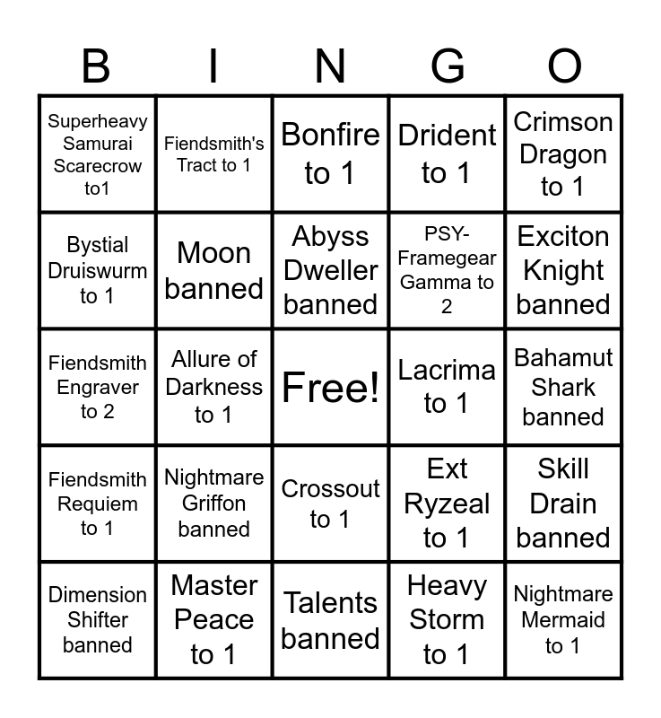 This bingo card has a free space and 24 words: Dimension Shifter banned, Nightmare Griffon banned, Abyss Dweller banned, Heavy Storm to 1, Crimson Dragon to 1, Superheavy Samurai Scarecrow to1, Fiendsmith's Tract to 1, Bonfire to 1, Lacrima to 1, Bahamut Shark banned, Fiendsmith Engraver to 2, Moon banned, Ext Ryzeal to 1, Skill Drain banned, Bystial Druiswurm to 1, Master Peace to 1, Talents banned, Drident to 1, Exciton Knight banned, Fiendsmith Requiem to 1, Allure of Darkness to 1, Crossout to 1, PSY-Framegear Gamma to 2 and Nightmare Mermaid to 1.