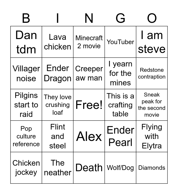 This bingo card has a free space and 24 words: Flint and steel, The neather, Creeper aw man, Chicken jockey, I am steve, Dan tdm, Villager noise, Lava chicken, This is a crafting table, Alex, I yearn for the mines, Pilgins start to raid, Ender Pearl, Flying with Elytra, Ender Dragon, Wolf/Dog, Sneak peak for the second movie, Minecraft 2 movie, Redstone contraption, They love crushing loaf, Diamonds, Pop culture reference, YouTuber and Death.