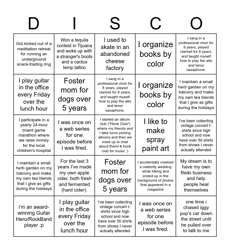 This bingo card has a free space and 44 words: Free!, one time i chased iggy pop’s car down the street until he pulled over to talk to me, My dream is to have my own Reiki business and help people heal themselves, i’m an award-winning Guitar Hero/RockBand player :p, I was the weekend manager for a motorcycle cafe and bar in college., I was once on a web series for one episode before I was fired., I used to skate in an abandoned cheese factory, I think the word sphincter is hilarious, especially in Bullwinkle’s voice!, I sang in a professional choir for 8 years, played clarinet for 8 years, and taught myself how to play the alto and tenor saxaphone., I play guitar in the office every Friday over the lunch hour, I organize books by color, I like to make spray paint art, Foster mom for dogs over 5 years, For the last 3 years I've made my own apple cider, both fresh and fermented (hard cider)., I once turned my basement into a makeshift recording studio and recorded a full EP with my college band using only borrowed equipment, I've been collecting vintage concert t-shirts since high school and now have over 50 shirts from shows I never actually attended, I spent a summer as a tour guide at an old lighthouse where I had to wear period-accurate clothing from the 1880s, I participate in a yearly 24-hour board game marathon where we raise money for the local children's hospital, I accidentally crashed a celebrity wedding while hiking and ended up in the background of photos that appeared in a magazine, I maintain a small herb garden on my balcony and make my own tea blends that I give as gifts during the holidays, Won a tequila contest in Tijuana and woke up with a stranger's boots and a cactus temp tattoo, Snuck into an exclusive Barcelona rooftop party by pretending to be a DJ's assistant, Collect hotel keycards from places I've "borrowed" bathrobes from, Got kicked out of a meditation retreat for running an underground snack-trading ring, I once turned my basement into a makeshift recording studio and recorded a full EP with my college band using only borrowed equipment, I've been collecting vintage concert t-shirts since high school and now have over 50 shirts from shows I never actually attended, I spent a summer as a tour guide at an old lighthouse where I had to wear period-accurate clothing from the 1880s, I participate in a yearly 24-hour board game marathon where we raise money for the local children's hospital, I accidentally crashed a celebrity wedding while hiking and ended up in the background of photos that appeared in a magazine, I maintain a small herb garden on my balcony and make my own tea blends that I give as gifts during the holidays, one time i chased iggy pop’s car down the street until he pulled over to talk to me, My dream is to have my own Reiki business and help people heal themselves, i’m an award-winning Guitar Hero/RockBand player :p, I was the weekend manager for a motorcycle cafe and bar in college., I was once on a web series for one episode before I was fired., I used to skate in an abandoned cheese factory, I think the word sphincter is hilarious, especially in Bullwinkle’s voice!, I started an album club ("Hook Club") where my friends and I take turns picking albums and then we meet up to chat about them! A book club for music :), I sang in a professional choir for 8 years, played clarinet for 8 years, and taught myself how to play the alto and tenor saxaphone., I play guitar in the office every Friday over the lunch hour, I organize books by color, I like to make spray paint art, Foster mom for dogs over 5 years and For the last 3 years I've made my own apple cider, both fresh and fermented (hard cider)..