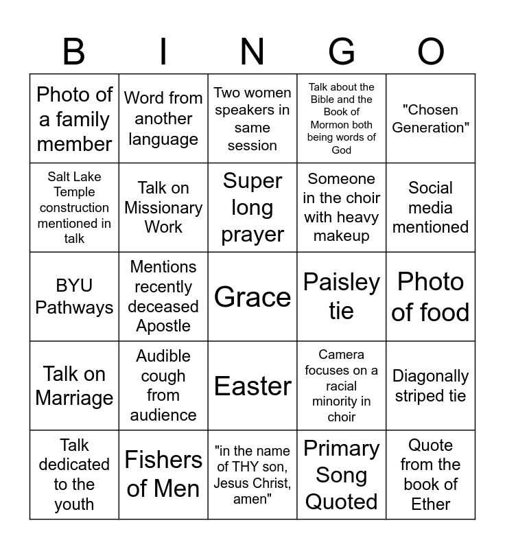 This bingo card has a free space and 34 words: Someone talks about their dead spouse, Primary Song Quoted, Primary Card Sung, Man cries about his children, Talk on Marriage, Talk on Missionary Work, "Chosen Generation", Talk dedicated to the youth, Word from another language, Talk on Service, Super long prayer, Two women speakers in same session, "Close Quote", Everyone laughs at a joke, Paisley tie, Social media mentioned, Fishers of Men, BYU Pathways, Audible cough from audience, Camera focuses on a racial minority in choir, Easter, Coffee Mentioned, Photo of a family member, Photo of food, "in the name of THY son, Jesus Christ, amen", Quote from the book of Ether, Talk about the Bible and the Book of Mormon both being words of God, Lehi mentioned, Someone in the choir with heavy makeup, Salt Lake Temple construction mentioned in talk, Bad dad joke, Mentions recently deceased Apostle, Diagonally striped tie and Talk from YW/YM Presidency.