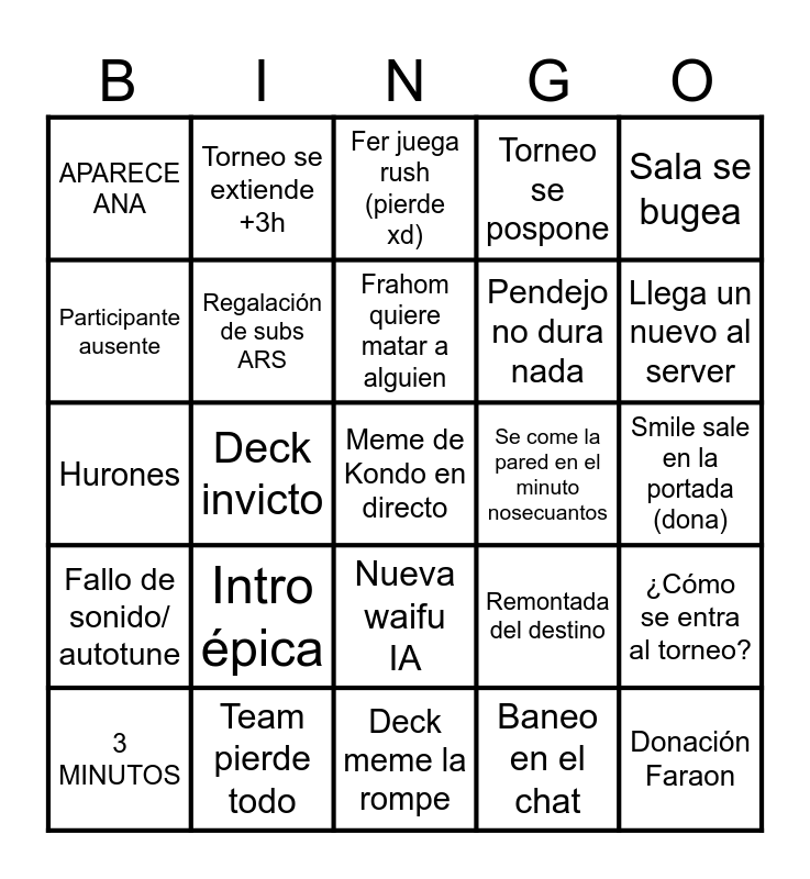 This bingo card has 25 words: Intro épica, Deck meme la rompe, Frahom quiere matar a alguien, 3 MINUTOS, Sala se bugea, APARECE ANA, Participante ausente, Torneo se extiende +3h, Se come la pared en el minuto nosecuantos, Nueva waifu IA, Pendejo no dura nada, Hurones, Remontada del destino, ¿Cómo se entra al torneo?, Regalación de subs ARS, Donación Faraon, Smile sale en la portada (dona), Fer juega rush (pierde xd), Llega un nuevo al server, Deck invicto, Meme de Kondo en directo, Team pierde todo, Fallo de sonido/ autotune, Torneo se pospone and Baneo en el chat.