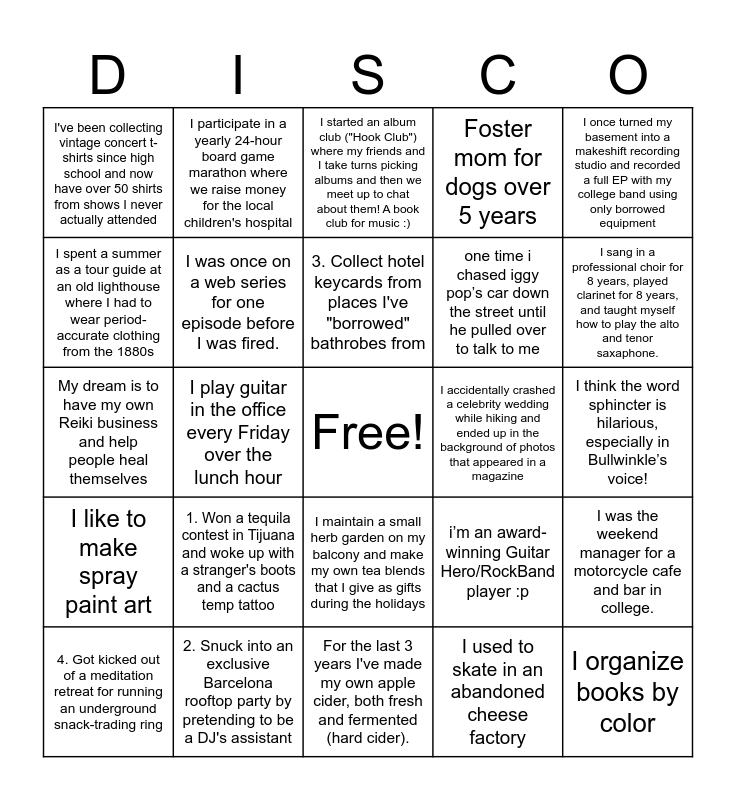 This bingo card has a free space and 24 words: 1. Won a tequila contest in Tijuana and woke up with a stranger's boots and a cactus temp tattoo, 2. Snuck into an exclusive Barcelona rooftop party by pretending to be a DJ's assistant, 3. Collect hotel keycards from places I've "borrowed" bathrobes from, 4. Got kicked out of a meditation retreat for running an underground snack-trading ring, I once turned my basement into a makeshift recording studio and recorded a full EP with my college band using only borrowed equipment, I've been collecting vintage concert t-shirts since high school and now have over 50 shirts from shows I never actually attended, I spent a summer as a tour guide at an old lighthouse where I had to wear period-accurate clothing from the 1880s, I participate in a yearly 24-hour board game marathon where we raise money for the local children's hospital, I accidentally crashed a celebrity wedding while hiking and ended up in the background of photos that appeared in a magazine, I maintain a small herb garden on my balcony and make my own tea blends that I give as gifts during the holidays, one time i chased iggy pop’s car down the street until he pulled over to talk to me, My dream is to have my own Reiki business and help people heal themselves, i’m an award-winning Guitar Hero/RockBand player :p, I was the weekend manager for a motorcycle cafe and bar in college., I was once on a web series for one episode before I was fired., I used to skate in an abandoned cheese factory, I think the word sphincter is hilarious, especially in Bullwinkle’s voice!, I started an album club ("Hook Club") where my friends and I take turns picking albums and then we meet up to chat about them! A book club for music :), I sang in a professional choir for 8 years, played clarinet for 8 years, and taught myself how to play the alto and tenor saxaphone., I play guitar in the office every Friday over the lunch hour, I organize books by color, I like to make spray paint art, Foster mom for dogs over 5 years and For the last 3 years I've made my own apple cider, both fresh and fermented (hard cider)..