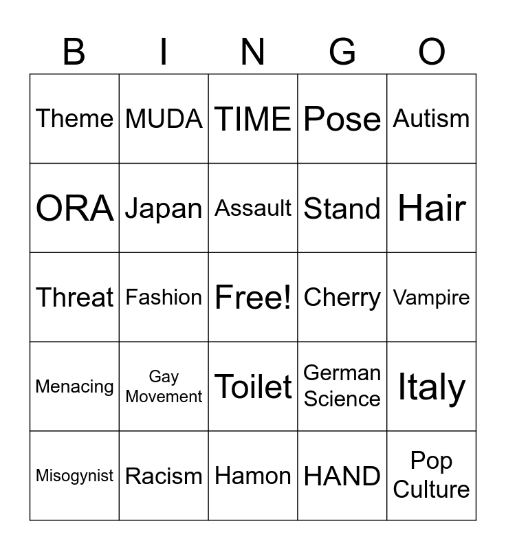 This bingo card has a free space and 24 words: Gay Movement, Racism, Assault, Misogynist, Autism, Theme, ORA, MUDA, Cherry, Toilet, Stand, Threat, German Science, Italy, Japan, HAND, Vampire, TIME, Hair, Fashion, Pop Culture, Menacing, Pose and Hamon.