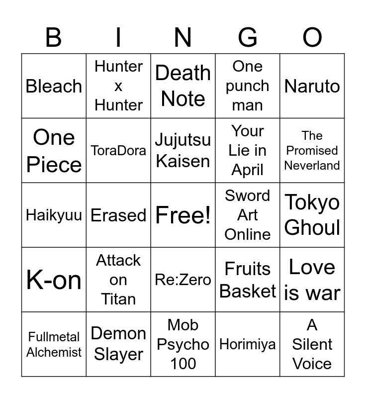 This bingo card has a free space and 24 words: Attack on Titan, Demon Slayer, Jujutsu Kaisen, Fullmetal Alchemist, Naruto, Bleach, One Piece, Hunter x Hunter, Sword Art Online, Re:Zero, Your Lie in April, Haikyuu, Fruits Basket, Love is war, ToraDora, Horimiya, Tokyo Ghoul, Death Note, The Promised Neverland, Erased, A Silent Voice, K-on, One punch man and Mob Psycho 100.
