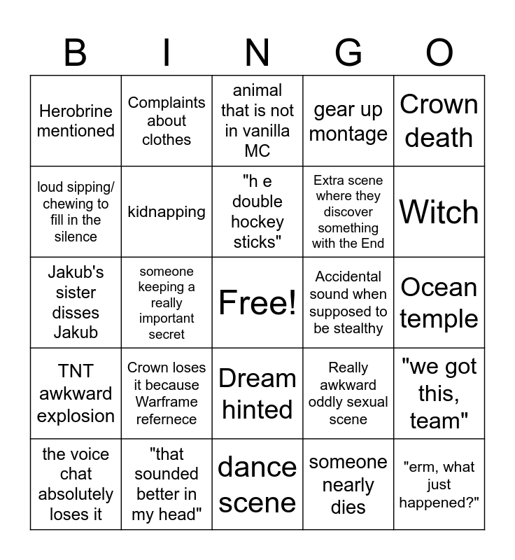 This bingo card has a free space and 24 words: Crown loses it because Warframe refernece, "that sounded better in my head", "h e double hockey sticks", the voice chat absolutely loses it, Crown death, Herobrine mentioned, loud sipping/ chewing to fill in the silence, Complaints about clothes, Accidental sound when supposed to be stealthy, Dream hinted, Extra scene where they discover something with the End, Jakub's sister disses Jakub, Really awkward oddly sexual scene, "we got this, team", kidnapping, someone nearly dies, Ocean temple, animal that is not in vanilla MC, Witch, someone keeping a really important secret, "erm, what just happened?", TNT awkward explosion, gear up montage and dance scene.